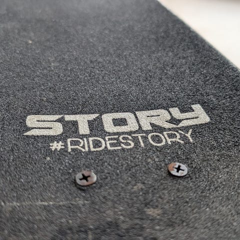 Story skateboard med blå deck og sort grip tape. Skateboardet har hjul og trucks monteret, egnet til almindelig skateboarding.