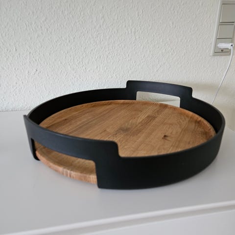 Serverings bakke i træ med integrerede håndtag. Det har en rund form og et naturlig træfinish, egnet til servering i køkkenet.