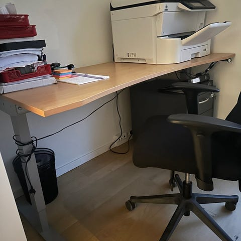 Hæve-sænkebord. Måler 160 cm x 80 cm på det dybeste sted, bordet buer ind ved siddepladsen. Fyldt funktionelt og i god stand. Af mærket Aj kontormøbler. Afhentning i København SV.