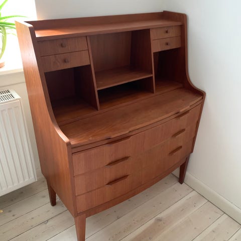Flot og charmerende vintage chatol i teaktræ fra 1960’erne med spejl og udtræksplade. Fremstår i flot stand med aldersrelaterede brugsspor. Chatollet har mange muligheder med sine 7 skuffer og spejl.