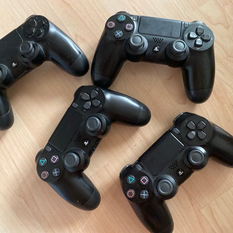 Sony PlayStation 4 DualShock trådløse controllere i fire forskellige farver: rød, gennemsigtig, sort og guld samt en ekstra motion controller. Pris 300 kr. stykket. Eller køb samlet for 1000 kr.