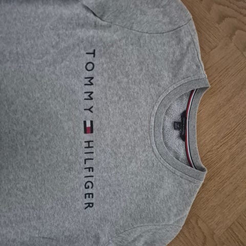 Tommy Hilfiger sweatshirt i grå bomuld. Den har rund hals og en synlig logo-detalje i bunden. Lille ubetydelig plet ved H foran - se billede 3.