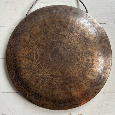 Gongen er brugt, men velholdt, ikke været i brug i mere end 30 år. Har en god lyd, velegnet til meditation, musik eller bare til pynt.