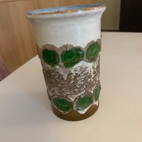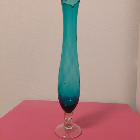 Den høje vase har en klar fod med mønster og måler 21 cm, den mindre vase måler 15 cm skålen måler Ø9 cm