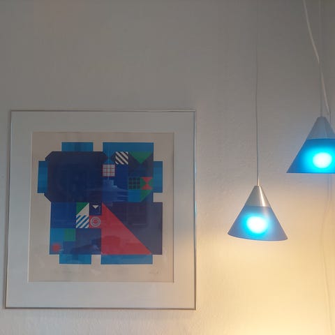 Elegant og original blå designlampe fra Jeka Metaltryk, en af Danmarks mest anerkendte belysningstilvirkere. Denne model, Stine, blev produceret i 1970’erne og er et klassisk eksempel på skandinavisk design fra tiden.