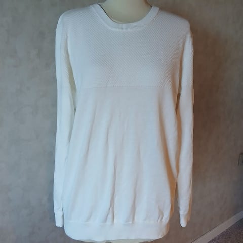 Cremefarvet sweater / trøje med lange ærmer og rund halsudskæring. Overdelen har et tekstureret mønster.