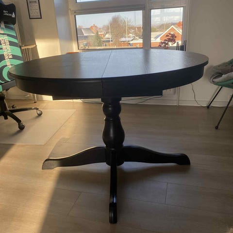 Har et par ridser og et mærke som fremgår af billederne, men det er nemt at holde bordpladen. Foden har også brugsspor.