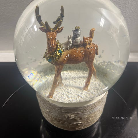 juledekoration sneglob med motiv af en hund, julegaver og en bold. Dekorationen er designet til julesæsonen.