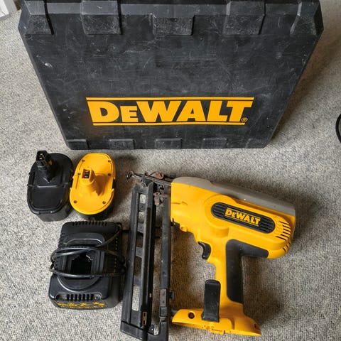 DeWalt sømpistol i gul og sort farve. Leveres med opbevaringskasse og brugsanvisning. Velegnet til professionelt brug til sømning i forskellige materialer.