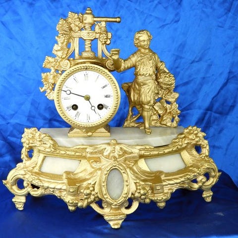 Fransk kaminur fra Napoleon III-perioden (ca. 1860-1880) i forgyldt urværk, rigt dekoreret i Rocaille/Louis XV-stil.