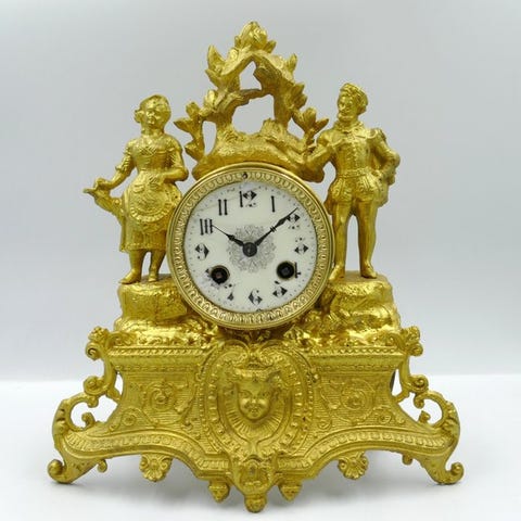 En fransk Napoleon III-æra pejsestokur i forgyldt régule og alabaster, 1850–1900, med mekanisk otter-dages bevægelse og halvtime slag på én gong, afbildende en vinavler, mål 31 × 34 × 13 cm, vægt ca. 3 kg, optrukket nøgle medfølger, i god brugt stand med små aldersmærker. Klik på den blå "gå til varen" knap, for at købe eller byde på denne vare. Den samlede pris vil blive vist inden du afgiver dit bud.