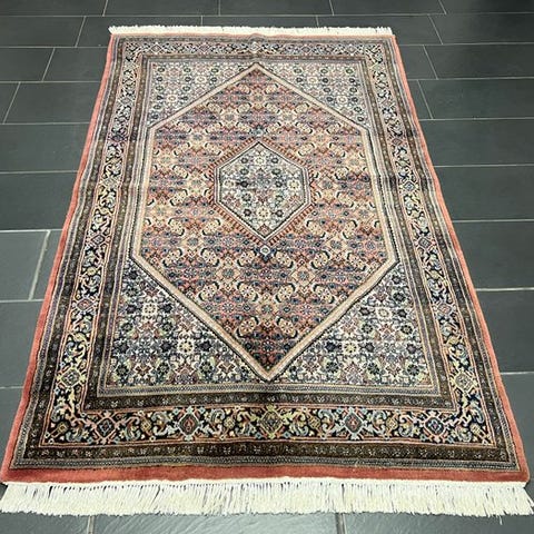 Oprindelse Indien; Model Bidjar - Renset; håndknyttet orientalsk tæppe i uld på bomuld, 240 × 166 cm, ca. 160.000 knuder pr. m², professionelt renset og med certifikat, generelt i god stand med ældnings- og brugsmærker. Klik på den blå "gå til varen" knap, for at købe eller byde på denne vare. Den samlede pris vil blive vist inden du afgiver dit bud.