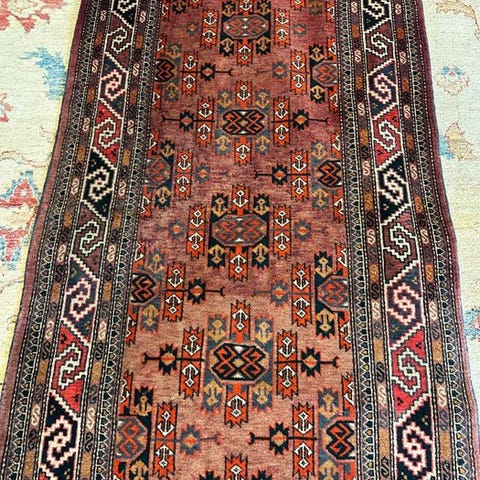 Afghansk model håndknyttet uldtæppe på bomuld, 200 cm × 96 cm, rødt med creme og sort, i meget god stand. Klik på den blå "gå til varen" knap, for at købe eller byde på denne vare. Den samlede pris vil blive vist inden du afgiver dit bud.