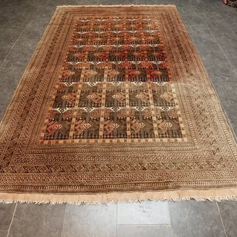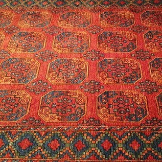 Smukt håndknyttet uldtæppe. Bomulden er naturligt farvet uden kemikalier. Hovedfarverne er rød, creme og sort. Tæppet er knyttet med smukke, professionelt stramme knuder og har korte frynser.