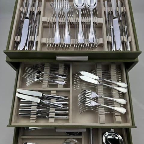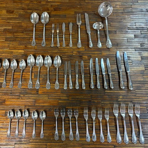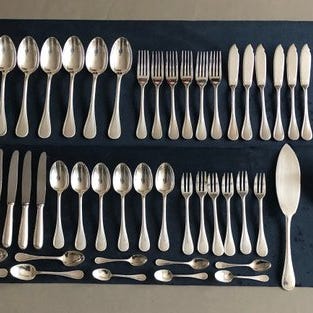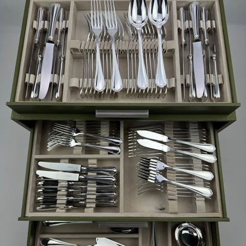 Lækkert Christofle bestiksæt model Rubans med 126 dele, i Louis XVI-stil, elegant og tidløst. Det berømte bånd- og sløjfemønster henviser til æstetikken i store franske palæer, med afbalancerede proportioner og fint udskårne detaljer. Den blanke finish fremhæver dekorens linjer og giver servicen en scenografisk tilstedeværelse, men altid sober: ideel til et formelt bord for 12 personer, til særlige lejligheder, eller som samlerobjekt fra en af de mest ikoniske maisoner inden for fransk sølvware.