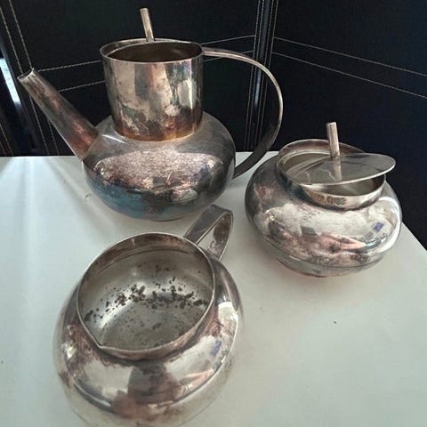 Sølvglansen er fremragende, med spejlblanke overflader og ensartet glans: en samling med stærk scenisk tilstedeværelse, perfekt både til brug og udstilling.