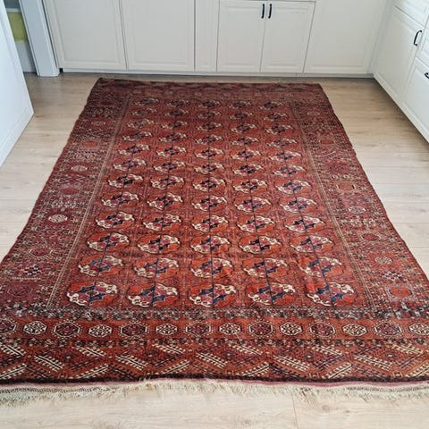 Det er et meget smukt Bukhara-tæppe fra Pakistan. Det er meget fint med 10x10 knuder, næsten en million knuder pr. kvadratmeter. Tæppet er i perfekt stand. Se venligst på billederne.