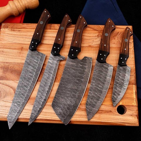 Foldet stål: Med et højkvalitets foldet stålblad er den træbaserede skaft fastgjort med stål mosaiknåle. Komfortabel i hånden, vil du frivilligt melde dig som aftenens kok. For samleren eller mesterkokken er dette sæt knive stilfuldt og holdbart. Hak, hakke, skær og udskær for at blive en mesterkok med dette alsidige køkkenredskab.