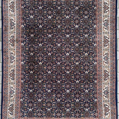 Indo Moud-tæppe fra Indien, uld på bomuld, håndvævet, 234 × 163 cm, fremstillet i det 21. århundrede, professionelt renset, i meget god stand. Klik på den blå "gå til varen" knap, for at købe eller byde på denne vare. Den samlede pris vil blive vist inden du afgiver dit bud.