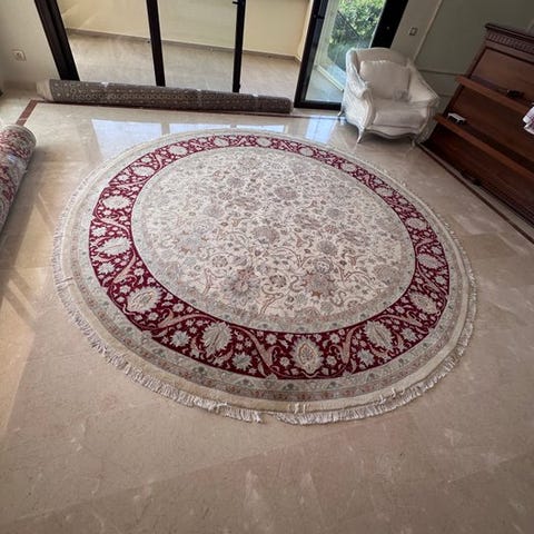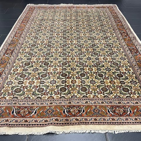 Oprindelsesland: Indien; Model: Tabriz; rund tæppe i uld på bomuld, 195 cm × 195 cm, 126 enheder, 21. århundrede, i meget god stand. Klik på den blå "gå til varen" knap, for at købe eller byde på denne vare. Den samlede pris vil blive vist inden du afgiver dit bud.