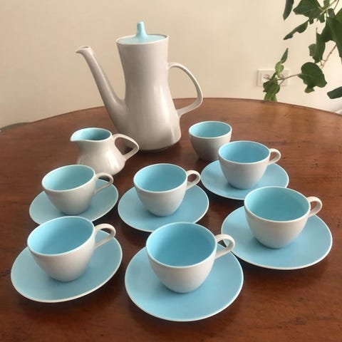 Fin benporcelæn kop- og underkop-sæt med 8 dele. Elegant engelsk scroll-design med blå og hvid bånd og guldaccenter. Fremstillet af Thomas Morris i det tidlige 20. århundrede, god vintage stand.