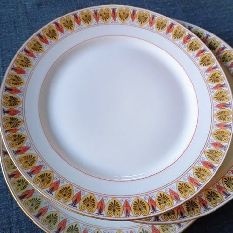 Tallerkenerne er også udsmykket med en guldtråd, der løber langs kanten. På kanten af tallerkenerne skifter en yderligere dekoration: en buket af blomster i forskellige typer og farver.