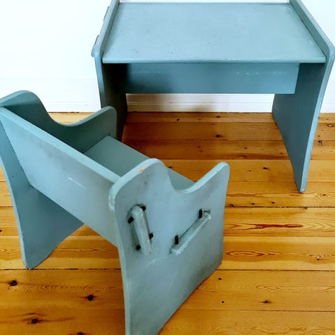 1 slag bænk i fin stand og 1 bord med let slid, begge håndlavet/malet fra Sri Lanka. 2 stk. øreklap stole, med slid, den ene stol skal repareres da stof er revnet på bagsiden. Sælges samlet