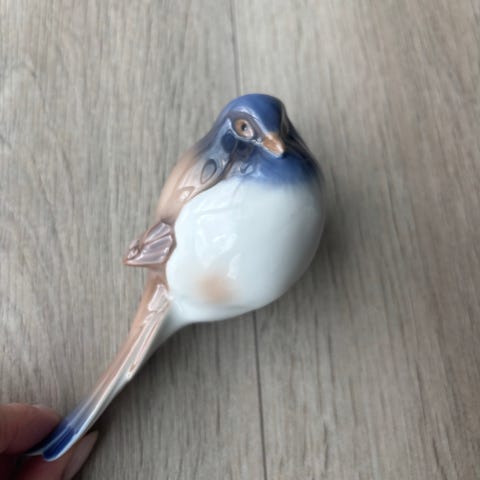 Royal Copenhagen fuglefigur i porcelæn med blå og brune farver. Figuren viser detaljeret udformning af en fugl med naturlige farvenuancer.