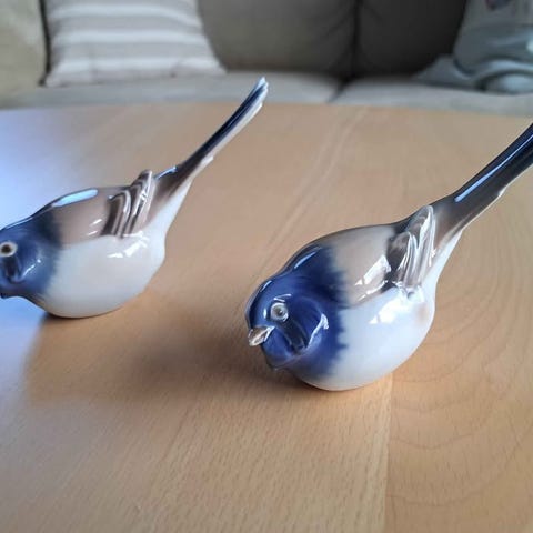 Bing og Grøndahl pessimist og optimist fuglefigur blå og brun porcelæn