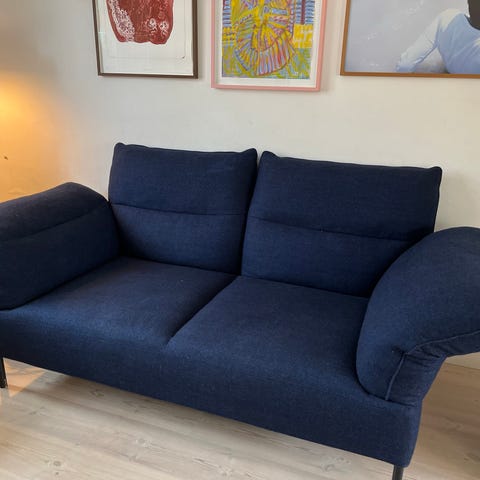 En skøn 2 personers sofa i mørk lilla med sorte knaster. Det høje ryglæn og dun puderne gør, at man synker dejligt ned i Hay sofaen og føler sig hjemme.