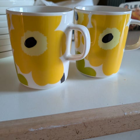 Marimekko Unikko kopper, 6 stk. 5 orange, 1 grøn. Nypris ca 1300 kr.