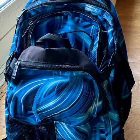 JEVA skoletaske/rygsæk i andre materialer til unisex. Rygsækken har et mønstret design med firkantede elementer i blå og grønne nuancer. Den har flere rum og justerbare skulderstropper samt polstret ryg for komfort. Der er plads til madpakke samt medfølgende taske til idrætstøj.