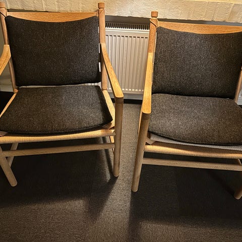 Rigtig fin stol med nogle små mærker efter brug med blå uld hynder