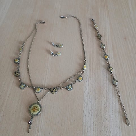 Helt nyt stilrent smykkesæt, armbånd og halskæde. Fået i gave, men går desværre ikke med sølvsmykker derfor Sælges det. Ny pris var 500
