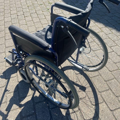 Sort sammenklappelig rullestol med metalramme og stofsæde. Designet til nem transport og opbevaring.