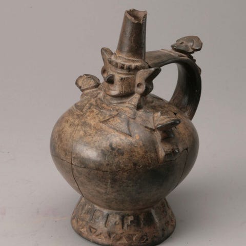 Præcolumbiansk (Peru) Chimu stigbøjlekar, 13-1400 tallet, med dekorative håndtag udformet som majskolber.