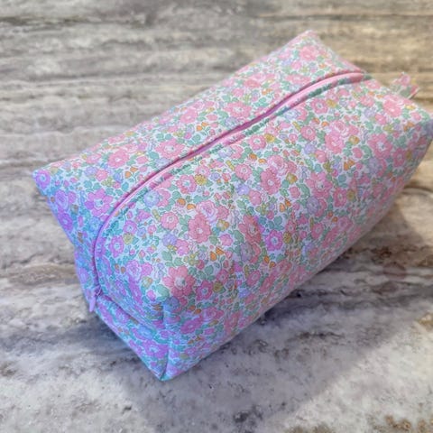 Håndsyet toilettaske/makeuptaske med stof fra Liberty of London samt inderstof i lyserøde og hvide tern i økologisk bomuld🌸