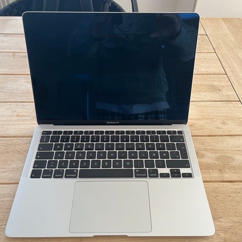 Apple MacBook Air laptop med aluminiumsdesign og indbygget tastatur. Velegnet til almindelig brug og bærbarhed.