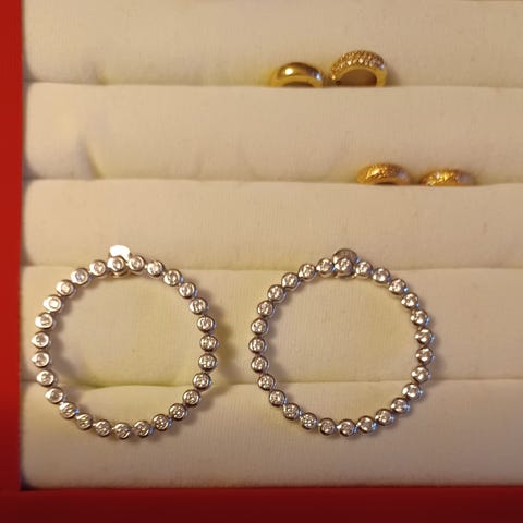 Pandora øreringe i forgyldt materiale med diamantdetaljer, designet til kvinder. Øreringene leveres med original æske og mærkat. Fra ny 999 kr