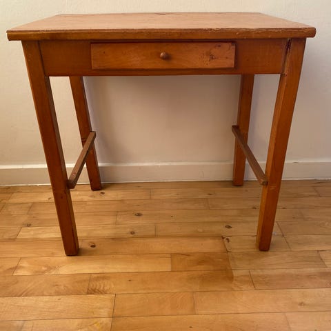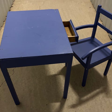Sættet står i 100% original stand med den smukkeste gyldne glød og patina. Bordet har synlige brugsspor på bordpladen og nede i skufferne - se billeder. Vi har brugt det som det er, da patinaen er fin og sættet som helhed er så smukt, så vi synes det ville være synd at male eller reparere bordpladen.