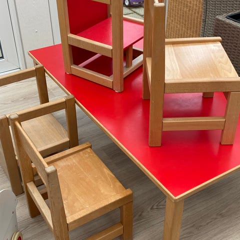 Smukt Kaare Klint børnemøbelsæt bestående af bord, stol og bænk.