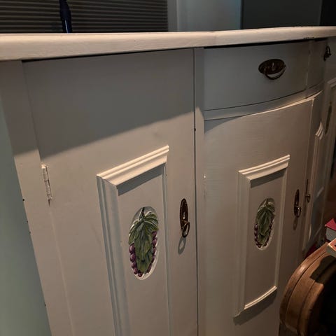 Antikt skænk i mørkt træ med to skuffer og to skabe. Skænken har dekorative udskæringer på fronten og en overdel med facet slebet glaslåger. Velegnet til opbevaring i stue eller spisestue.