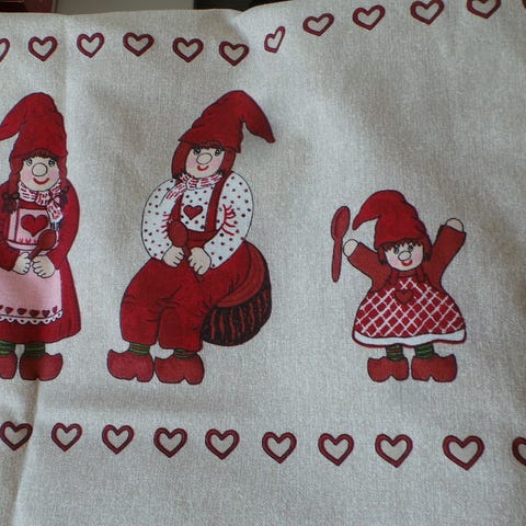 Fin lille gammel juledug i hessian med nisser.