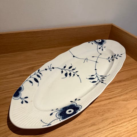 Royal Copenhagen blå musselmalet riflet oval fad til servering måler 17x37 cm. (helt nyt/stadig i æske) afhentes på Islands Brygge eller kan sendes