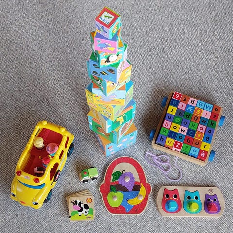 Skolebus, stabelklodser, træklodser, puslespil, bog, bil