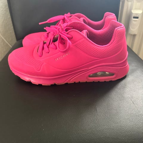 Et par Skechers sneakers i pink med perforerede detaljer og synlig air-pude i hælen. Skoene er i størrelse 38 og har snørebåndslukning. De har en solid gummisål med mønster for bedre greb. Der står 'SKECHERS' på siden af skoen, og logoet er placeret på bagsiden samt sålen.