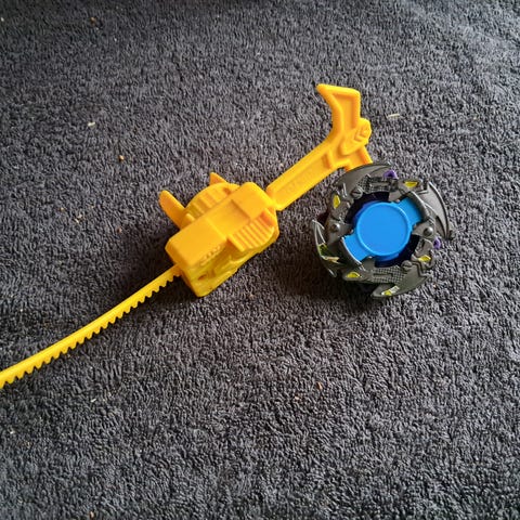 Lilla Beyblade snurretop fra gamle dage med sort launcher/spinner.
