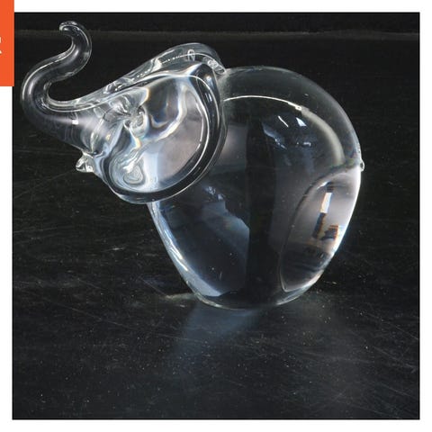 En dekorativ figur formet som en elg, lavet af glas. Elgens krop er brun med sorte pletter, og geviret er klart glas. Figuren har en størrelse på 14x14 cm, og bunden af figuren har en stregkode påsat.