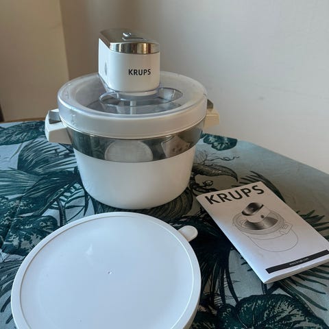 En Krups ismaskine, der bruges til at lave is derhjemme. Den har et hvidt ydre og en gennemsigtig skål, hvor ingredienserne kan ses under blanding. Maskinens størrelse er 26x20 cm. Den har en enkelt knap på toppen for betjening.