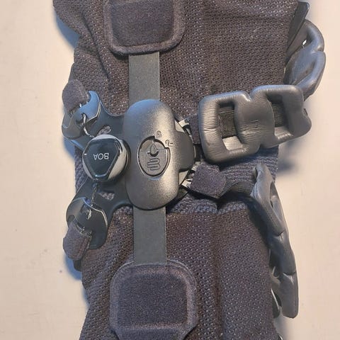 Denne genstand er en DonJoy knæskinne, designet til at give støtte til knæet. Den er lavet af letvægtsmaterialer og har en kompleks struktur med justerbare remme for optimal pasform og støtte. Knæskinnen leveres med en netpose for nem opbevaring og transport. Modellen er Donjoy Full force med en nypris på 6000 kr. Den måler 49x15 cm.
